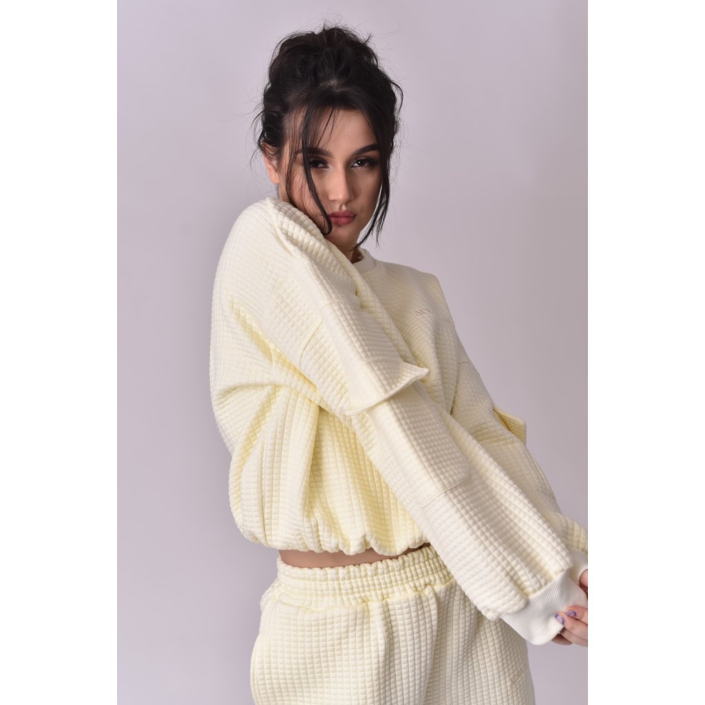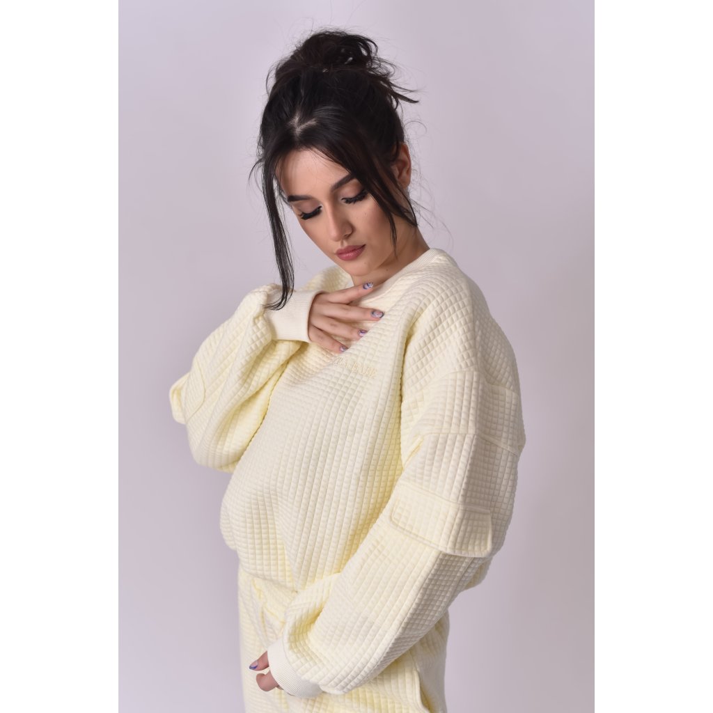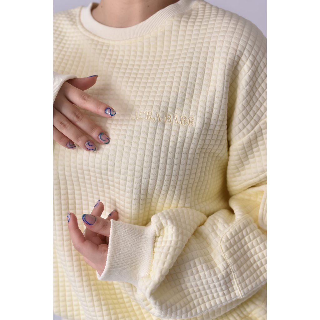 Set je z prošívané látky, která je "heavy". Díky tomu se nemačká a drží stálý tvar. Vrch i spodek mají výšivku Aura Babe, barevně tón v tónu setu.