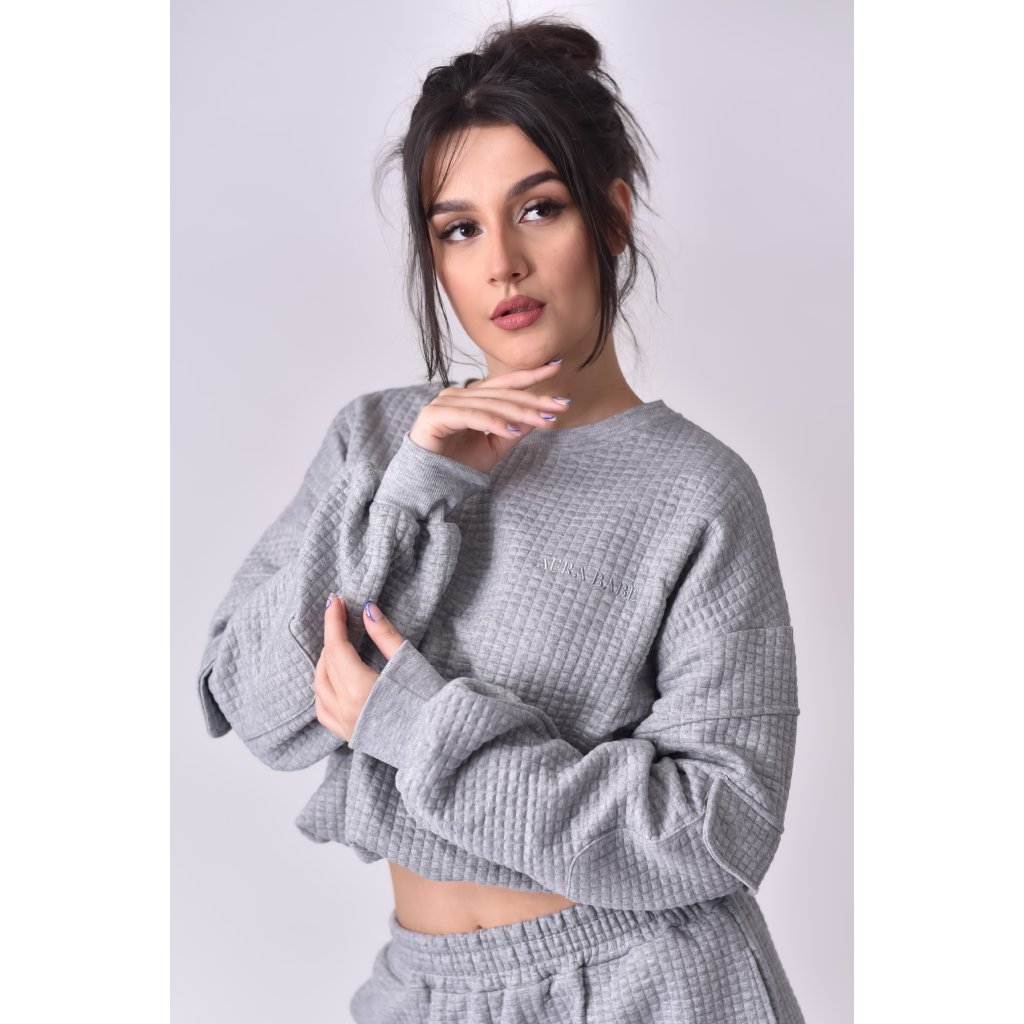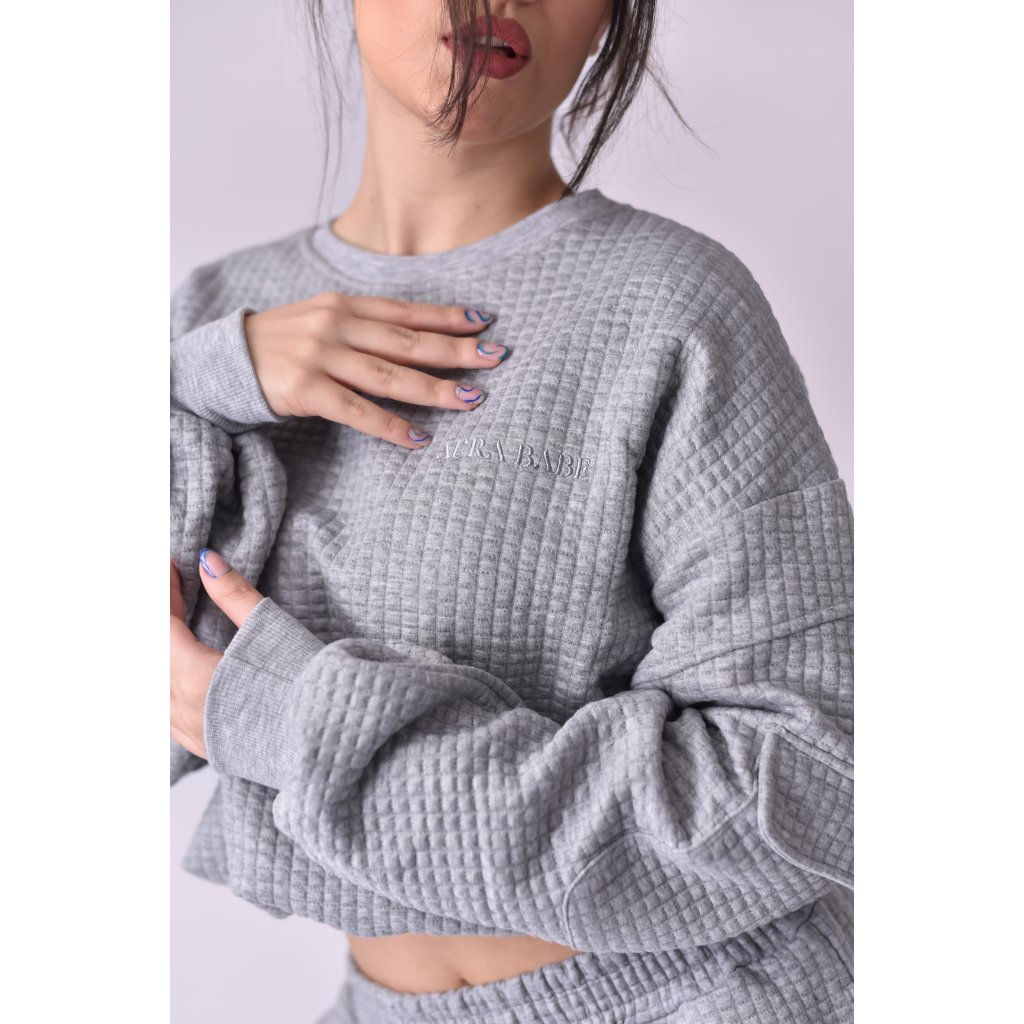 Set je z prošívané látky, která je "heavy". Díky tomu se nemačká a drží stálý tvar. Vrch i spodek mají výšivku Aura Babe, barevně tón v tónu setu.